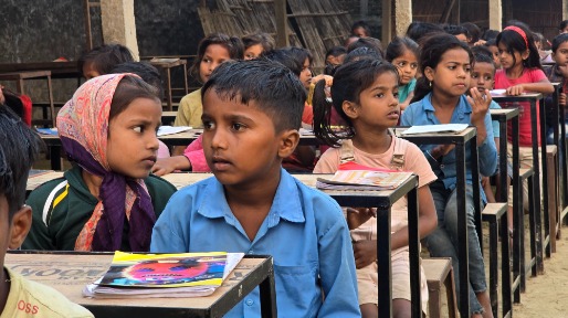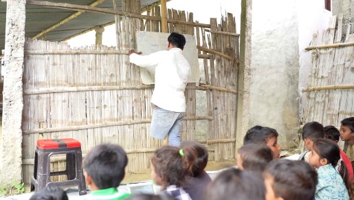 There is no proper classroom — just a temporary sheet roof that collapses during heavy rains.